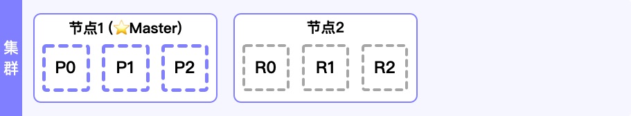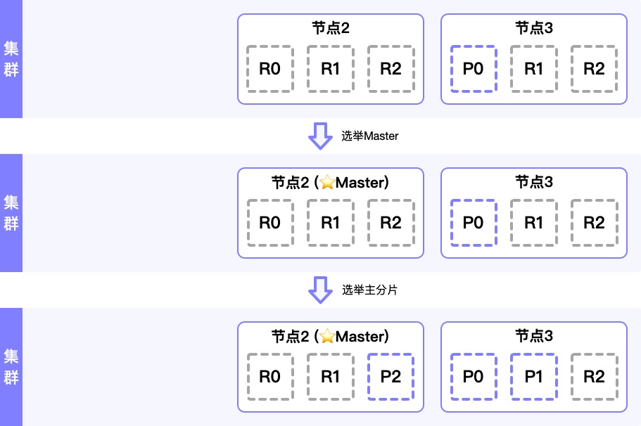 然后,由于P1和P2在已经关机的”节点1”上,在没有”主要分片”的情况下,也是无法支撑正常数据服务的。但好在我们”节点1”上所有的主要分片P1和P2在其他节点上都有副本,所以接下来,需要从”副本分片”选举出新的”主要分片”:”节点2”的R2升为P2,”节点3”的R1升为P1。