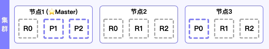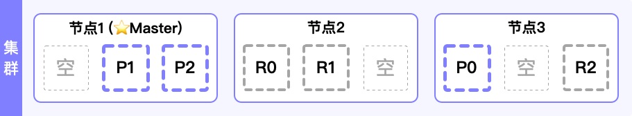 可以看到,原来”节点1”的P0分片和”节点2”的R2分片移动到了新的”节点3”上,从每个节点有3个分片变成了每个节点有2个分片,意味着每个分片可以占有的CPU/内存资源更多了。